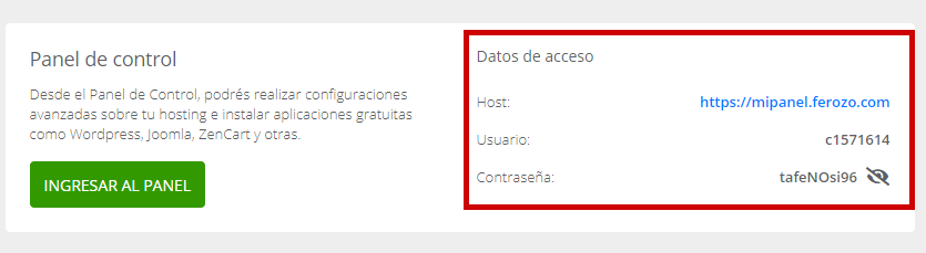 5- En el panel que aparece a continuación apareceran los datos de ingreso en la tarjetita que dice Panel de Control (para ver la contraseña hacer click en el ícono del ojo)