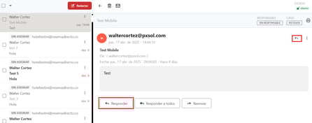 Al abrir un correo, encontraremos las opciones para Responder o Responder a todos. Estas pueden ubicarse en la parte inferior del mensaje o en la esquina superior derecha de la pantalla.