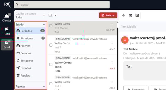 Sin asignar: incluye los correos que aún no han sido asignados a ningún agente, similar al funcionamiento en los chats.