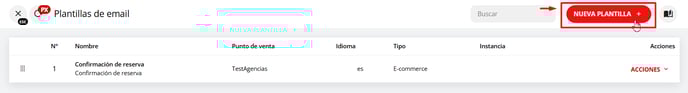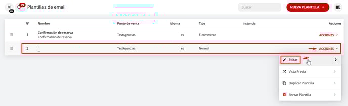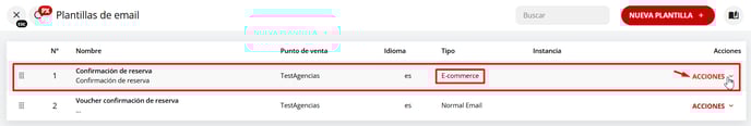 5 - Una vez que hayas creado el voucher, dirígete a la plantilla designada como "E-commerce", que se envía automáticamente con cada reserva realizada a través de tu motor de reservas, haz clic en "Acciones" y selecciona la opción "Editar".