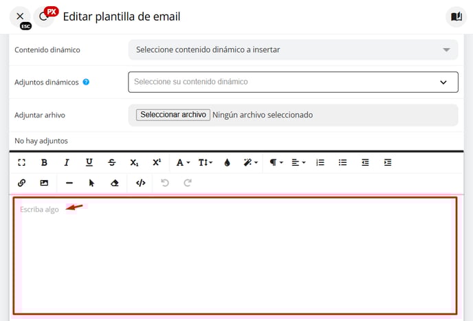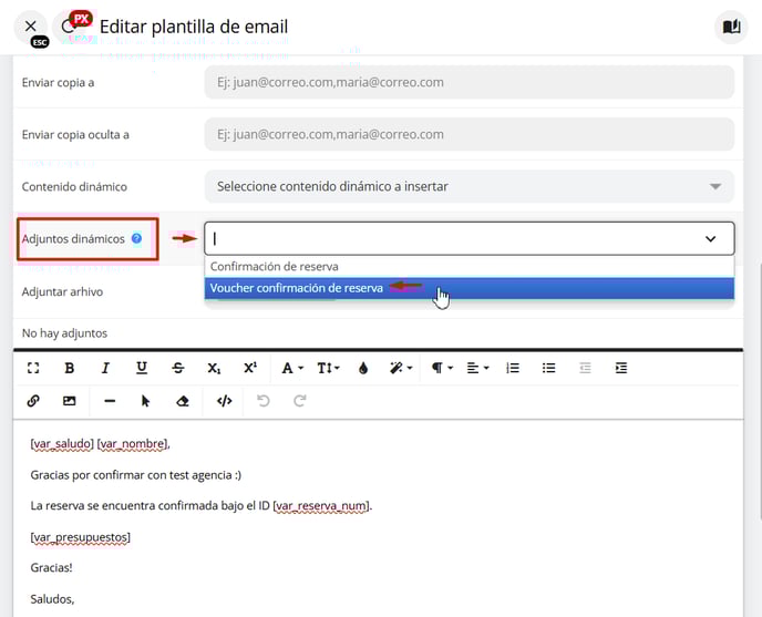 6 - Se abrirá la ventana de edición de la plantilla. En esta sección, localiza el campo titulado "Adjuntos dinámicos". Al hacer clic en este campo, se desplegará un selector que te permitirá visualizar todas las plantillas que has creado. Desde allí, podrás elegir la plantilla correspondiente al voucher que deseas adjuntar.