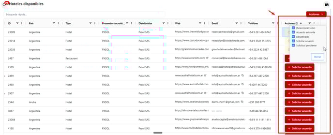 Acciones: permite gestionar acuerdos directos con el hotel y consultar su estado.