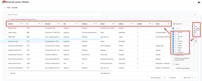Para filtrar información específica, en la parte derecha de la tabla podrás encontrar las columnas disponibles. Desde allí, puedes elegir cuáles columnas deseas visualizar y cuáles prefieres ocultar.