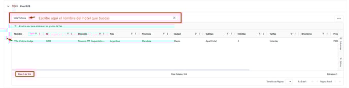 Además, puedes aplicar filtros por columna. Para hacerlo, haz clic en el ícono de filtro y selecciona la información que deseas filtrar. Por ejemplo, puedes filtrar por la columna "País" para mostrar únicamente los hoteles disponibles en Chile. Al final de la tabla, podrás ver el número de resultados filtrados en comparación con el total de resultados.