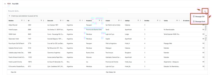 Para descargar la información, ya sea con filtros aplicados o sin ellos, dirígete a los tres puntos que se encuentran en la parte derecha de la tabla. Allí encontrarás dos opciones disponibles para la descarga: