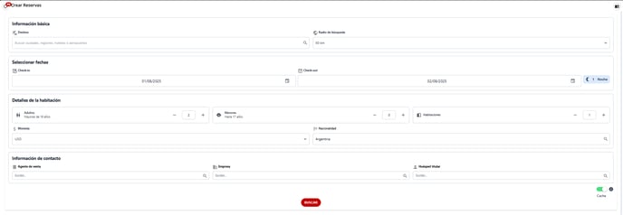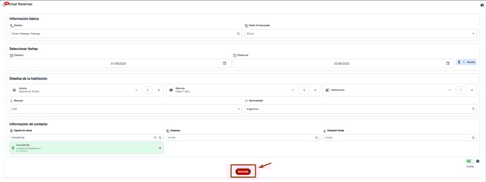 Información del contacto: Aquí puedes seleccionar al cliente para el cual estás realizando la cotización. Es importante que este cliente ya esté registrado como contacto en el sistema. Puede tratarse de una agencia, una empresa o un usuario final.