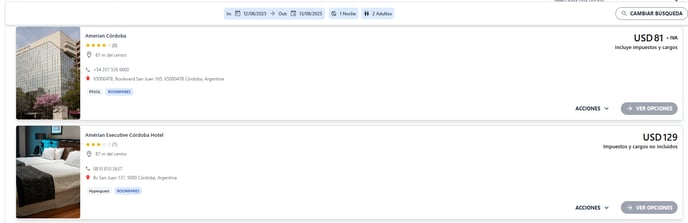 5 - Se mostrarán los hoteles disponibles de acuerdo con la ubicación que has ingresado. Elige el hotel que más se ajuste a las necesidades de tu cliente.