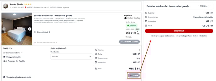 7 - Después de elegir las habitaciones que se ajusten a la ocupación deseada, haz clic en el botón "Continuar" para avanzar en el proceso de reserva.