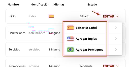 5- Debajo del nombre encontrarán un listado de las secciones de su web, desde el menú de acciones podrán elegir qué idioma van a editar.