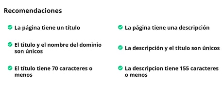 Título: Uno de los pilares principales es contar con un título SEO, claro. El titulo seo tiene como objetivo, que el usuario y los buscadores entiendan rápidamente de que trata la web. Es un Título Corto, de no más de 60 caracteres que tambien ayudará a ubicarse al usuario dentro de la web