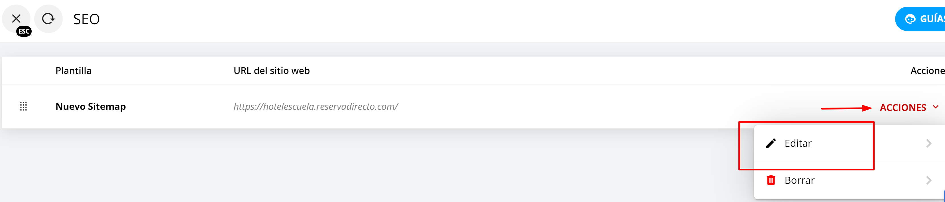 4- Esto creará un nuevo sitemap, en el que deberás entrar al menú de acciones que está a la derecha y hacer click en Editar
