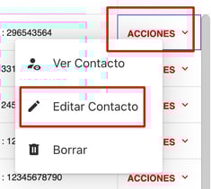 3- Dentro de la lista de contactos empresa, hacer click en el menú de acciones de la empresa a la que queremos asociar el contacto y hacer click en Editar Contacto