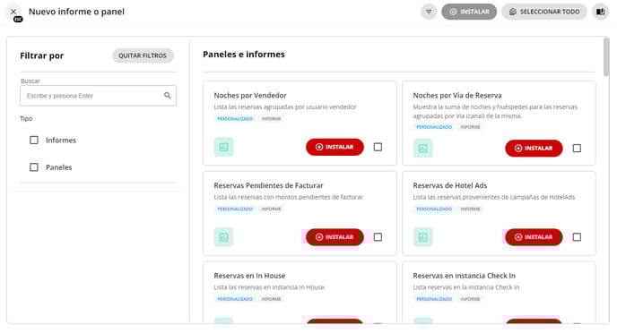 3- Esto desplegará un panel donde mostrará una biblioteca con los informes y paneles que puede agregar a su lista. Podrás filtrar por el Tipo que quieras instalar