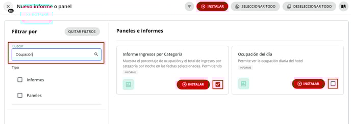 4- Buscar y Seleccionar el o los Informes/Paneles que desea agregar