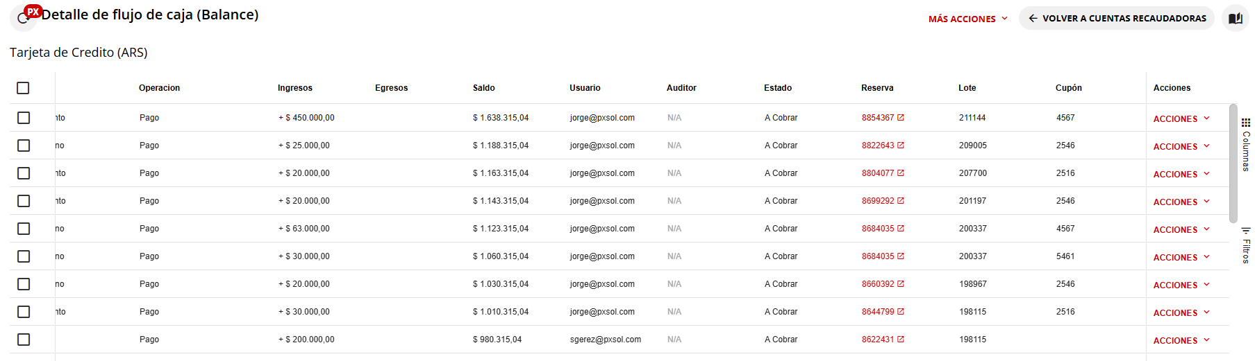 4- Se mostrará el listado de movimientos realizados dentro de dicha cuenta.