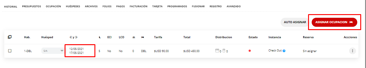 6- La solapa de Ocupación se actualizará con la nueva fecha de asignación. Posteriormente, cliquear en "asignar habitación":