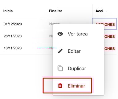 3- Para borrar una tarea, hacer click en el menú de Acciones a la derecha de la tarea que deseas editar