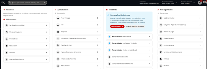 2- Para desplegar el menú de opciones puede cliquear sobre el buscador o presionar ALT+S. Dicho menú agrupará las aplicaciones y módulos agrupándolas por producto.