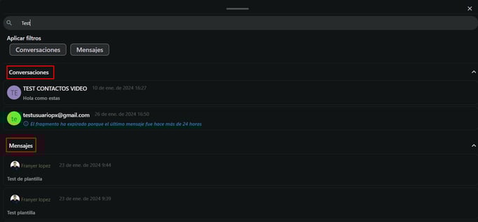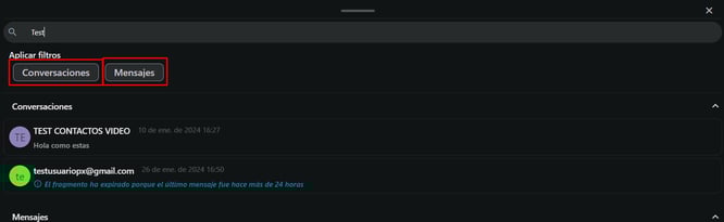 4- Podrán filtrar las búsquedas de Conversaciones o Mensajes haciendo clic en los siguientes botones