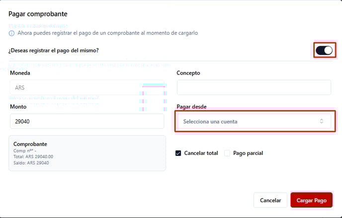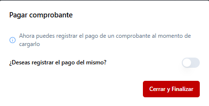 En caso de que esta factura ya haya sido pagada, podrá cargarse el pago en conjunto con la factura. En ese caso encendemos el Switch que figura en la ventana emergente y luego seleccionaremos la cuenta recaudadora con la que se pagó esta factura.