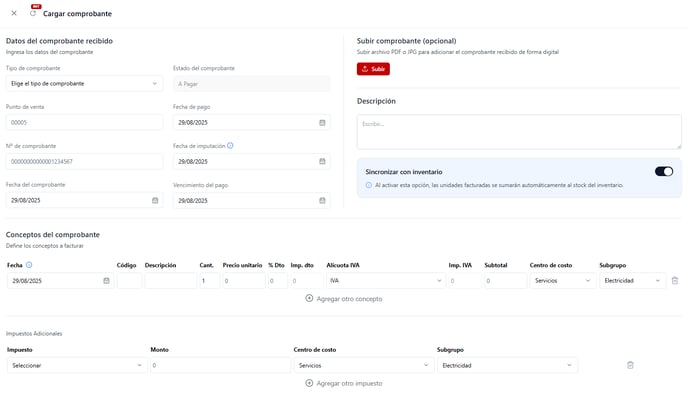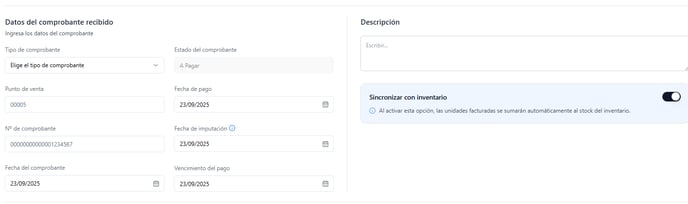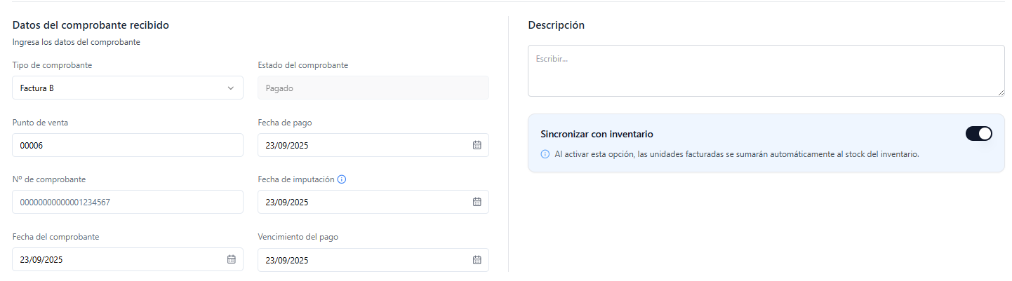 4.2 - Datos del comprobante recibido: Cargar los datos de la factura del proveedor o revisar que la IA haya cargado todos los datos correctamente.