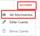 2- Seleccionar el nombre del Proveedor para ingresar a la cuenta o hacer click en el menú de Acciones que está a la derecha del proveedor al que desea cargar una factura y luego hacer click en Ver Movimientos.