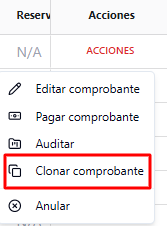 1- Seleccionar Acciones en la factura que queremos repetir y luego seleccionar Clonar Comprobante.