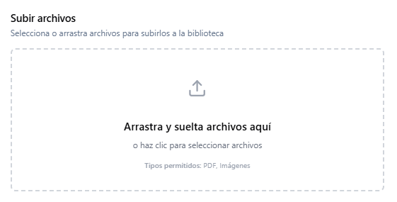 4.1.2- Se abrirá una ventana con la biblioteca de archivos del sistema. Hacer clic en la selección de archivos o arrastra el archivo a la biblioteca