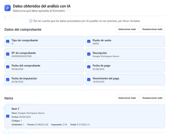 4.1.4- Una vez subido el comprobante se podrán seleccionar todos los parámetros que la IA ha detectado y que puede cargar automáticamente. Deseleccionar en caso de que algún parámetro no se necesite cargar o modificar.