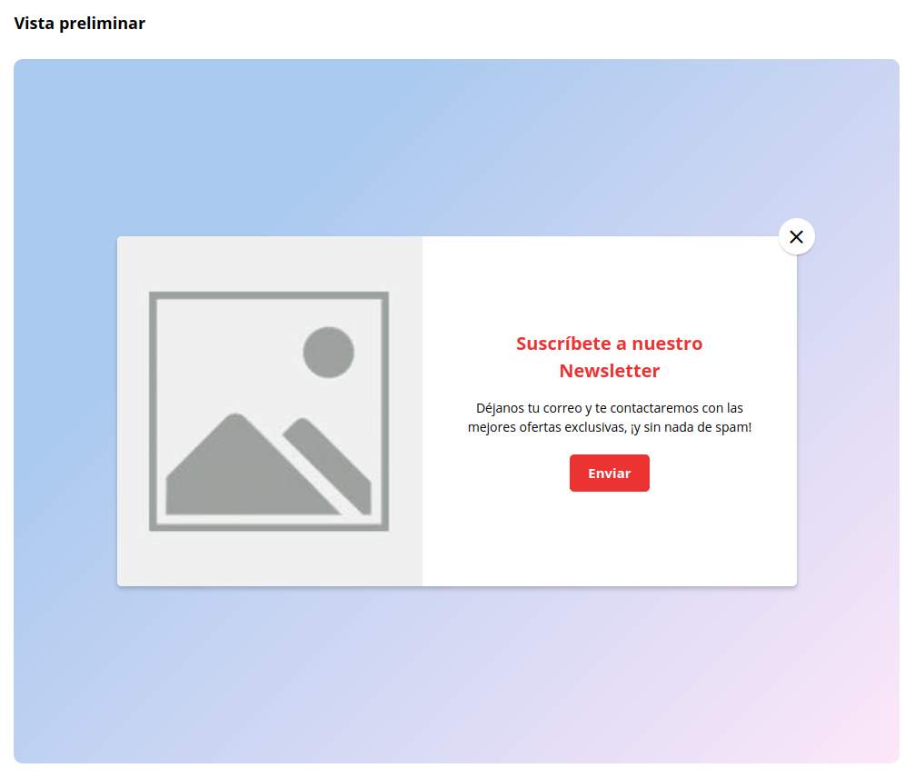 - Popup: ventana emergente personalizable que se puede configurar vertical u horizontal, que lo tome de una promoción y seleccionar cuál en base a las creadas, o como Newsletter.