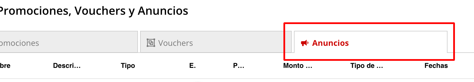 2- Cuando ingresan a la aplicación verán sus vistas de Promociones - Vouchers y Anuncios en listas independientes dentro de una tabla. Colocarse en la vista Anuncios