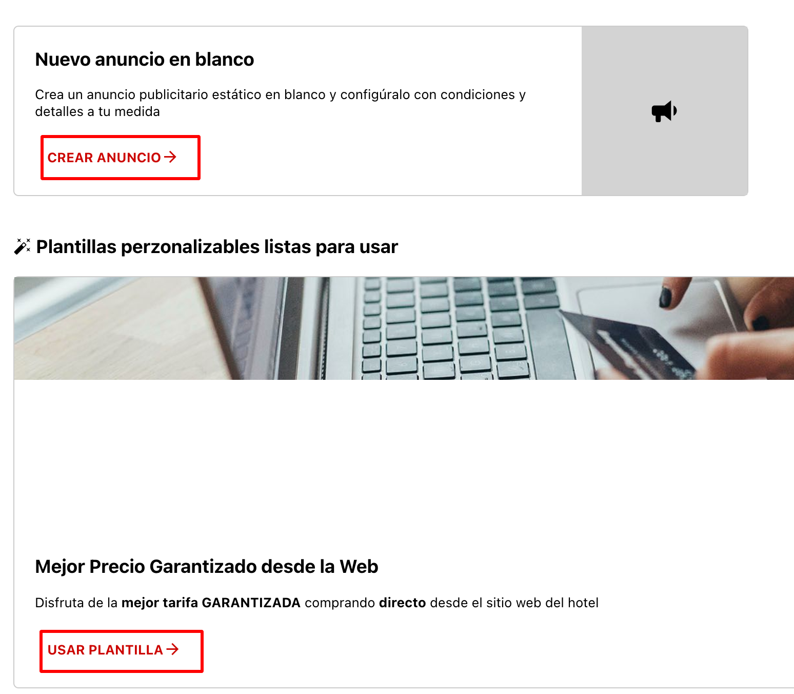 - Seleccionar si van a crear un anuncio en blanco o si van a partir de un anuncio ya prearmado. Hacer click sobre el banner de Nuevo anuncio en blanco si quieren hacer una promoción desde cero, o hacer click en alguna de las plantillas para partir de la configuración prearmada