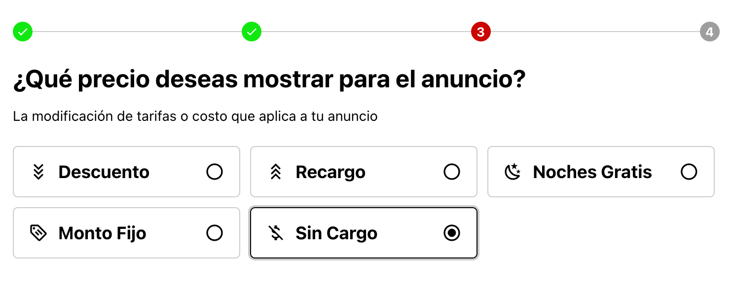 Seleccionar la forma en que este anuncio va a modificar la tarifa de la reserva: seleccionar una de las opciones Descuento - Recargo - Noche Gratis - Monto Fijo - Sin Cargo