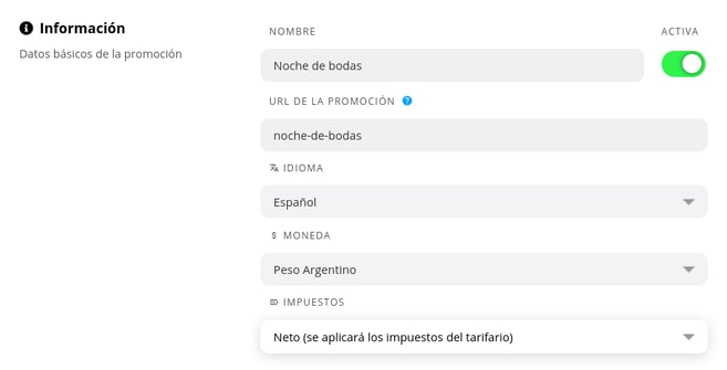 - URL de la promoción: se creará automáticamente la terminación de la URL al escribir el nombre de la promoción, separando las palabras con guiones. Podrá ser editada luego de colocar el nombre.