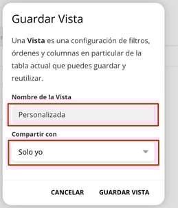 7- Se abrirá un popup en el que debes colocar el nombre de tu vista personalizada y si la vista debe estar disponible solamente para tu usuario o para todos los usuarios del hotel. Luego hacer click en Guardar vista