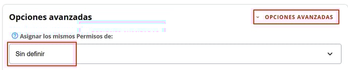 5- Si desean aplicarle a todos los usuarios los mismos permisos que un usuario existente, deben seleccionar OPCIONES AVANZADAS y luego, Asignar los mismos Permisos de, seleccionado el usuario correspondiente: