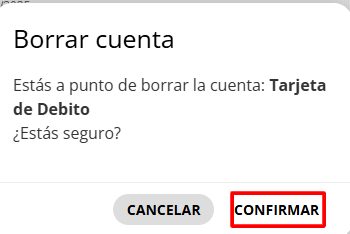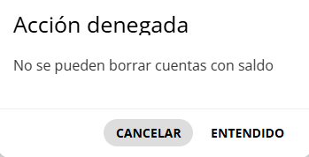 Si la cuenta tiene un saldo distinto de 0, el aviso que figurará al intentar Borrar una cuenta será el siguiente:
