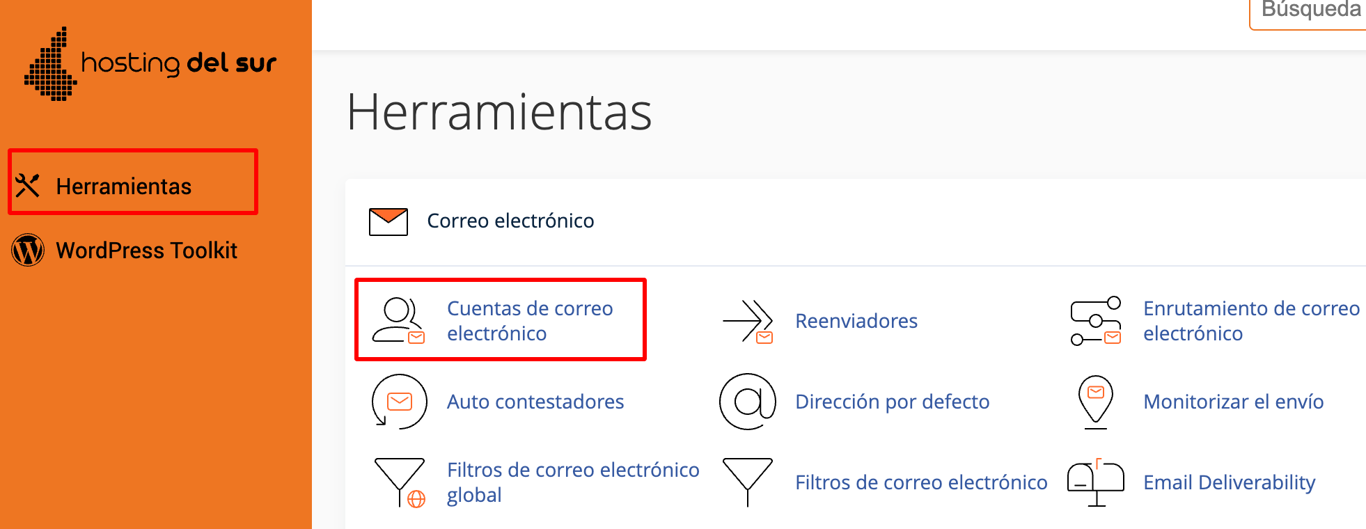 ¿Cómo encontrar los datos de usuario, contraseña y servidor, en tu hosting de correo de HOSTING DEL SUR?