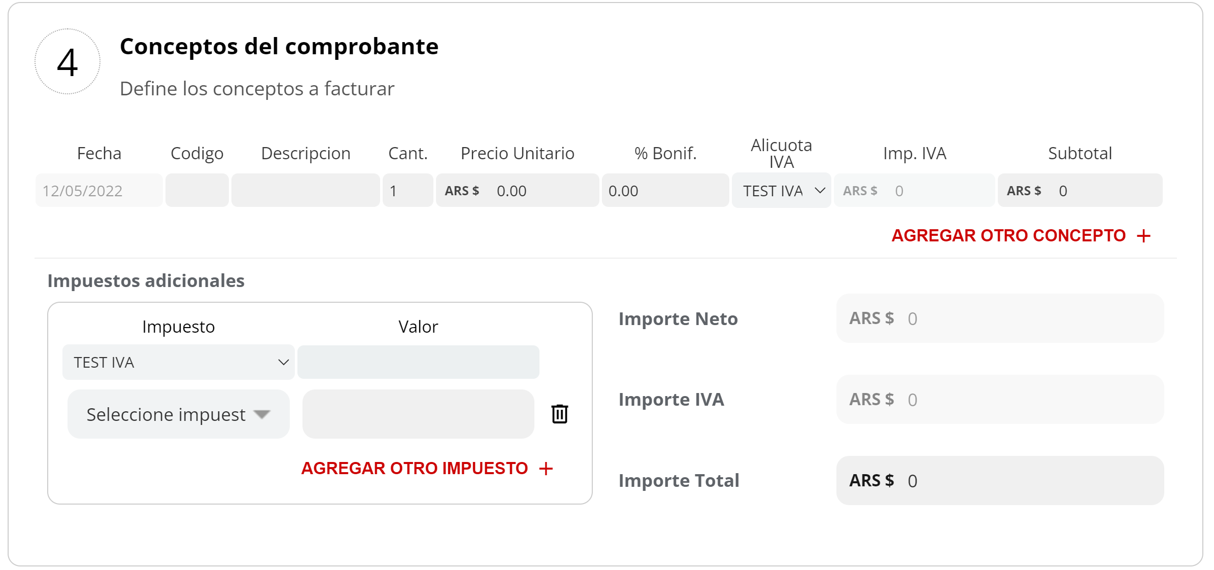 - Colocar los datos de los conceptos: Código - Descripción - Cantidad - Precio Unitario - Alicuota