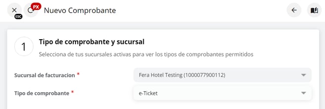 - Seleccionar la sucursal de facturación (podrá seleccionar entre las que tiene vinculadas en pxsol a su establecimiento)