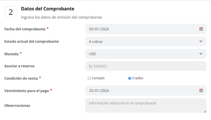 - Asociar Reserva: Permite vincular el comprobante a una reserva colocando el número de la reserva.