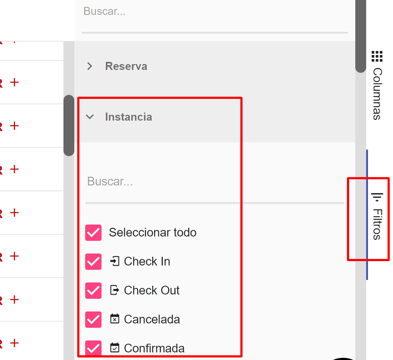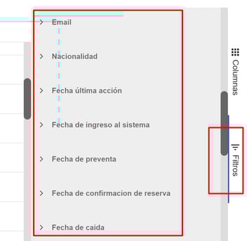 3- Haciendo click en la columna que se desea usar para filtrar, aparece un buscador y los parámetros por los que puedes filtrar tus reservas. Utiliza el que sea más útil para tu búsqueda.