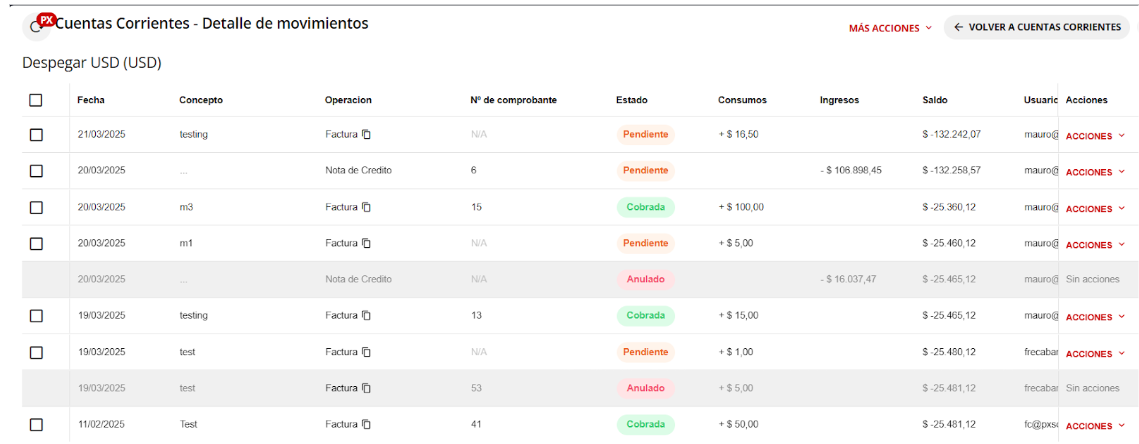 4- Se mostrará el listado de movimientos realizados dentro de dicha cuenta.