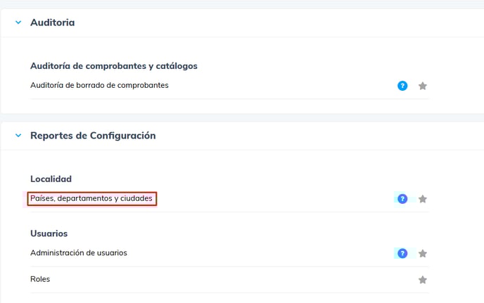 3- Desplazarse hasta la sección de Reportes de Configuración y hacer clic en Países, departamentos y ciudades.