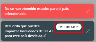Cuando se intente Facturar un país, ciudad o estado que no haya sido importado desde SIIGO, figurará una alerta que nos indicará que podrán cargar ese país, estado o ciudad en SIIGO e importarlos en Pxsol.
