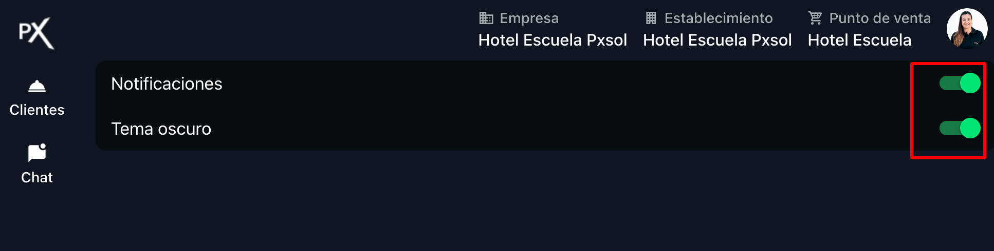 3- En el panel que se despliega, podrá activar o desactivar el modo oscuro y activar o desactivar las notificaciones desde el switch a la derecha de cada una de las opciones