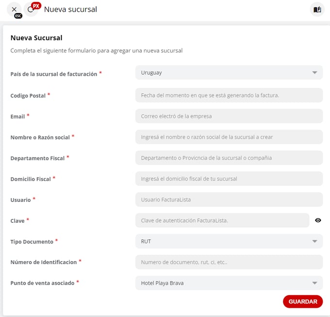 País de la sucursal de facturación: seleccionar el país en el cual se emitirán los comprobantes, dependiendo el país, serán los campos que se solicitarán completar
