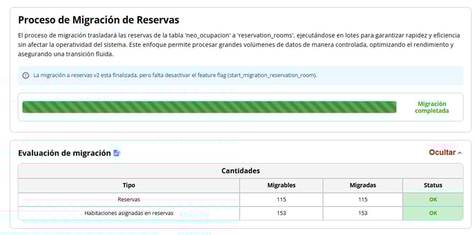 6- Una vez finalizada la migración, figurará Migración completada y tendrá un cuadro con la Evaluación de Migración y el detalle de reservas y habitaciones que se migraron OK.