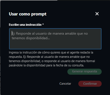 - Usar como prompt: Permite generar una respuesta con alguna instrucción que se le entregue a la IA. Ejemplo: Responder cortesmente que no tenemos disponibilidad para esa fecha, pero que nos pondremos en contacto en caso de habilitarse alguna habitación.