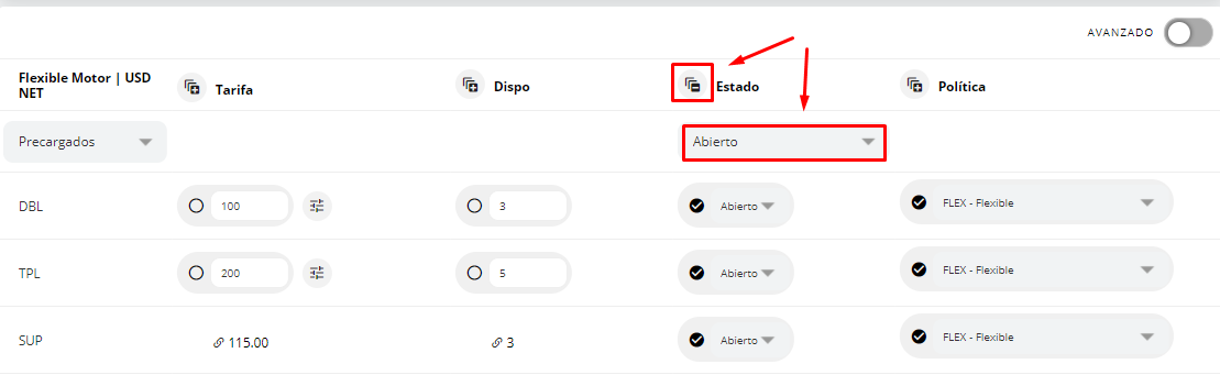 Se pueden editar habitaciones individualmente cliqueando sólo el estado de la misma, o todas las habitaciones juntas desde la opción de “+” al lado de “Estado” y luego en el campo que va a aparecer abajo colocar "Abierto". Se colocará la política por defecto que tiene configurado el tarifario; sin embargo en caso de precisarlo se puede personalizar la política para dicho periodo y tarifario.